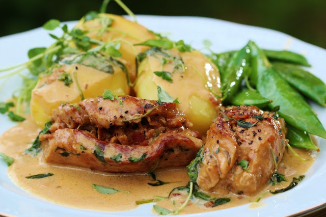 Fyllningen blev ett fräs med bacon, purjolök och lite färsk timjan. Rulladerna puttrar först i en buljong, sedan tillsätter man grädde och det får puttra lite till. Precis på slutet lyfter man ur rulladerna, kastar ner färsk babyspenat i grädden och stuvar minutsnabbt. Såsen blir helt fantastiskt god och rulladerna saftiga och smakrika. Servera med kokt potatis (jag fick tag på vinterpotatis jippi) eller ris och gärna snabbfrästa sugar snaps som blir härligt knapriga.