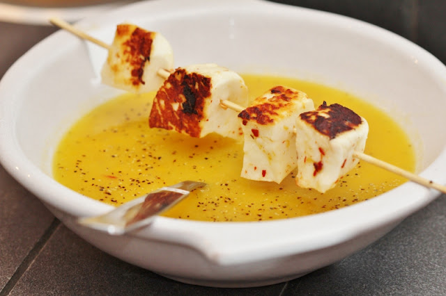 Stek halloumin till riktigt fin färg och ät sedan så fort som möjligt medan osten är sådär mjuk och härlig. Du kan skippa att servera på spett. Stek då i skivor och lägg på ett fat bredvid för var och en att ta för sig av.